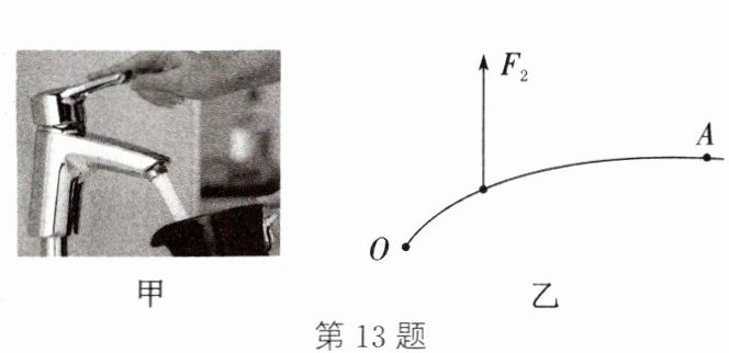 13. “节约用水,人人有责”,用水后及时关闭水龙头的情景如图甲。水龙头手柄可以视为一根杠杆,请你在图乙中画出施加在A点的最小动力$ F_1 $及阻力力臂$ l_2 $。(保留作图痕迹)