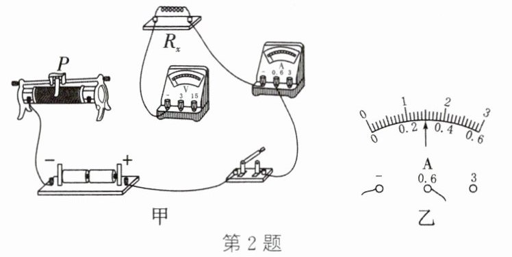 2. 有一只阻值未知的定值电阻$R_{x}$,图甲是用“伏安法”测$R_{x}$阻值的部分实物电路,电源电压恒为$3V$,滑动变阻器最大阻值为$10\Omega$。