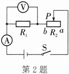 2. 在如图所示的电路中,电源电压保持不变,电路中滑动变阻器上标有“50Ω 0.5A”字样,电流表的量程为0~0.6A,电压表的量程为0~3V,电阻$R_{1}$的阻值为10Ω。闭合开关,当滑片在滑动变阻器的最右端时,电压表的示数为2V。求: