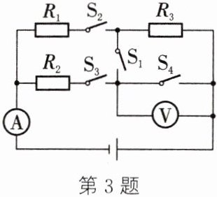 3. 如图所示的电路中,电源电压恒定,定值电阻$R_{1}=10Ω$。闭合开关$S_{1}$、$S_{2}$,断开开关$S_{3}$、$S_{4}$时,电压表的示数为6V,电流表的示数为0.2A;闭合开关$S_{1}$、$S_{3}$,断开开关$S_{2}$、$S_{4}$时,电压表的示数是4.8V。求: