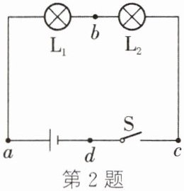 2. 如图所示,闭合开关 $ S $ 时,灯泡 $ L_1 $、$ L_2 $ 都不亮,用一根导线的两端接触 $ a $、$ b $ 两点时两灯也不亮;接触 $ b $、$ c $ 两点时,两灯仍不亮;接触 $ c $、$ d $ 两点时,两灯都亮。下列分析中正确的是 (