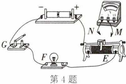 4. 如图,闭合开关,灯泡不亮。在闭合开关且不拆开导线的情况下,将 $ N $ 接电源负极,$ M $ 依次试触 $ E $、$ F $、$ G $ 接线柱,发现电压表示数第一次接近 $ 3 \, V $,后两次为零。若故障只有一个,则可能是 (