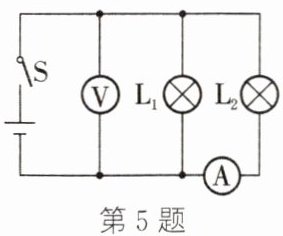 5. 如图所示的电路中,闭合开关 $ S $,两灯均正常发光;一段时间后,一灯突然熄灭,另一灯仍正常发光,其中一只电表的示数不变,另一只电表的示数变小。下列判断中,正确的是 (