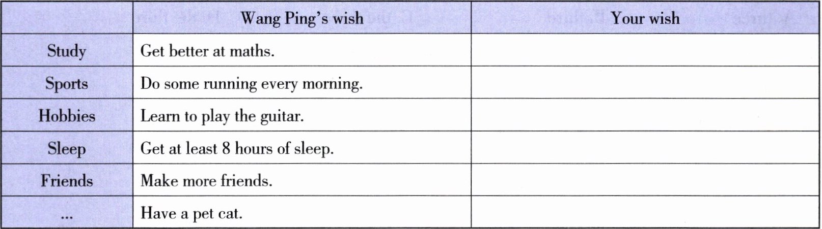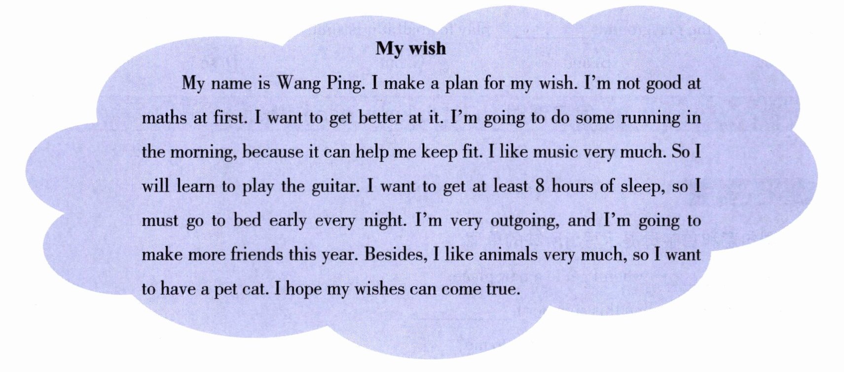 My name is Li Xinyi. I make a plan for my wish. I have an American net friend, so I want to get better at English. I join a swimming club, because I want to learn swimming. I like travelling very much. In winter holiday, I'm going to Hainan with my parents. I often stay up. I will go to bed early to get enough sleep this year. I want to make more friends. Besides, I like reading, I will read more books this year. I hope my wishes can come true.