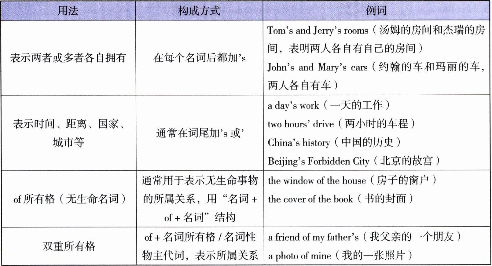 |of 所有格(无生命名词)|通常用于表示无生命事物的所属关系,用“名词 + of + 名词”结构|the window of the house(房子的窗户)the cover of the book(书的封面)|