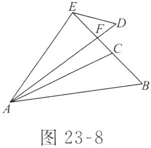 13. (12 分)如图 23 - 8 所示,$ \triangle ABC $ 绕点 $ A $ 旋转得到 $ \triangle ADE $,恰好使点 $ C $ 旋转后落在直线 $ BC $ 上的点 $ E $ 处,已知 $ \angle ACB = 105^{\circ} $,$ \angle CAD = 10^{\circ} $,求 $ \angle DFE $ 和 $ \angle B $ 的度数.
