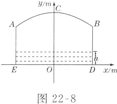 19. (14 分)如图 22 - 8 所示,小河上有一拱桥,拱桥及河道的截面轮廓线由抛物线的一部分 $ ACB $ 和矩形的三边 $ AE $,$ ED $,$ DB $ 组成,已知河底 $ ED $ 是水平的,$ ED = 16 $ m,$ AE = 8 $ m,抛物线的顶点 $ C $ 到 $ ED $ 的距离是 $ 11 $ m,以 $ ED $ 所在直线为 $ x $ 轴,抛物线的对称轴为 $ y $ 轴建立平面直角坐标系.