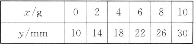50 【解析】由题可得,当放入 0g 物品时,秤砣所挂位置与提纽的距离为 10mm,当放入 2g 物品时,秤砣所挂位置与提纽的距离为$10+2×2=14(mm)$,当放入 4g 物品时,秤砣所挂位置与提纽的距离为$10+2×4=18(mm)$,当放入 6g 物品时,秤砣所挂位置与提纽的距离为$10+2×6=22(mm)$,当放入 8g 物品时,秤砣所挂位置与提纽的距离为$10+2×8=26(mm)$,当放入 10g 物品时,秤砣所挂位置与提纽的距离为$10+2×10=30(mm)$,……所以当放入$x$g 物品时,秤砣所挂位置与提纽的距离为$(10+2x)mm$,所以当$x=20$时,秤砣所挂位置与提纽的距离$y=10+2×20=50(mm)$.