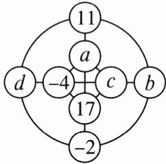 -14或7【解析】因为$-2-4-6-8+11+13+15+17=36$,横行、竖列以及内外两圆圈上的4个数之和都相等,所以这个和为$36÷2=18$.所以$a=18-(11+17-2)=-8$,$c=18-(-8-4+17)=13$,$b+d=18-(-4+13)=9$.当$b=-6$时,$d=9-(-6)=15$,$a+d=-8+15=7$;当$b=15$时,$d=9-15=-6$,$a+d=-8+(-6)=-14$.故答案为-14或7.