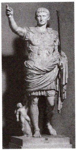 材料 公元前1世纪,古罗马出现了许多著名政治人物的青铜雕像。其中有一座全身人像高大魁梧,身着华丽的盔甲,左手执权杖,右手向上举起,食指指向前方,好像在指挥千军万马奋勇向前。整体形象强劲有力,形神兼备,栩栩如生。这是军事独裁者屋大维的雕像。