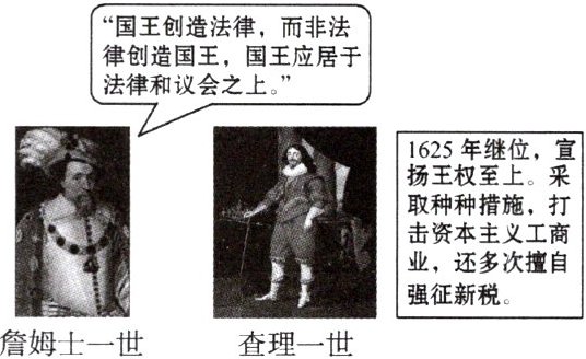 (1)詹姆士一世和查理一世推行君主专断政策,无视议会的权力,议会和王权矛盾激化。
