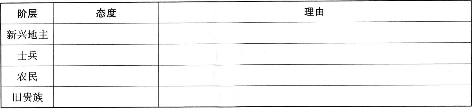 (1)地主:支持,因为商鞅变法规定,废除旧的土地制度,废除贵族的世袭特权,确立新的政治经济秩序。士兵:支持,因为商鞅变法规定,奖励军功,对有军功者授予爵位并赏赐土地。农民:支持,因为商鞅变法规定,鼓励耕织,生产粮食、布帛多的人可免除徭役。旧贵族:反对,因为商鞅变法规定,废除贵族的世袭特权。
