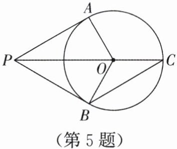 5. 如图,$PA$,$PB是\odot O$的切线,切点分别为$A$,$B$,$PO的延长线交\odot O于点C$,连接$OA$,$OB$,$BC$.若$AO = 2$,$OP = 4$,则$\angle C$等于(