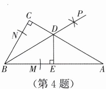 4. (2023,永州,10)如图,在$\mathrm{Rt}\triangle ABC$中,$\angle C = 90^{\circ}$,以点$B$为圆心,任意长为半径画弧,分别交$AB$,$BC于点M$,$N$,再分别以点$M$,$N$为圆心,以大于$\dfrac{1}{2}MN$的定长为半径画弧,两弧交于点$P$,作射线$BP交AC于点D$,作$DE\perp AB$,垂足为$E$,则下列结论不正确的是(