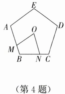 4. 如图,$ M $,$ N $ 分别是正五边形 $ ABCDE $ 的两边 $ AB $,$ BC $ 上的点,且 $ AM = BN $,点 $ O $ 是正五边形 $ ABCDE $ 的中心,则 $ \angle MON $ 的度数是______.
