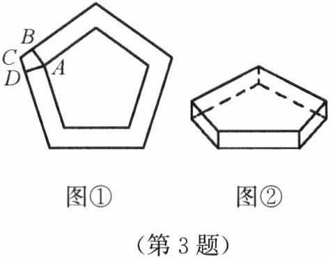 3. 将一块正五边形纸片(如图①)做成一个底面仍为正五边形且高相等的无盖纸盒(侧面均垂直于底面,如图②),需在每一个顶点处剪去一个四边形,如图①中剪去的是四边形 $ ABCD $,其中 $ \angle BAD $ 的度数是