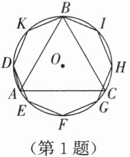 1. 如图,在同一个圆中作圆的内接正三角形 ABC 和正八边形 DEFGHIBK.连接 AD,则$\angle ADE$的度数是(