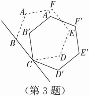 3. (2023,连云港,14)以正六边形 ABCDEF 的顶点 C 为旋转中心,按顺时针方向旋转,使得新正六边形$A'B'C'D'E'F'的顶点D'$落在直线 BC 上,则正六边形 ABCDEF 至少旋转