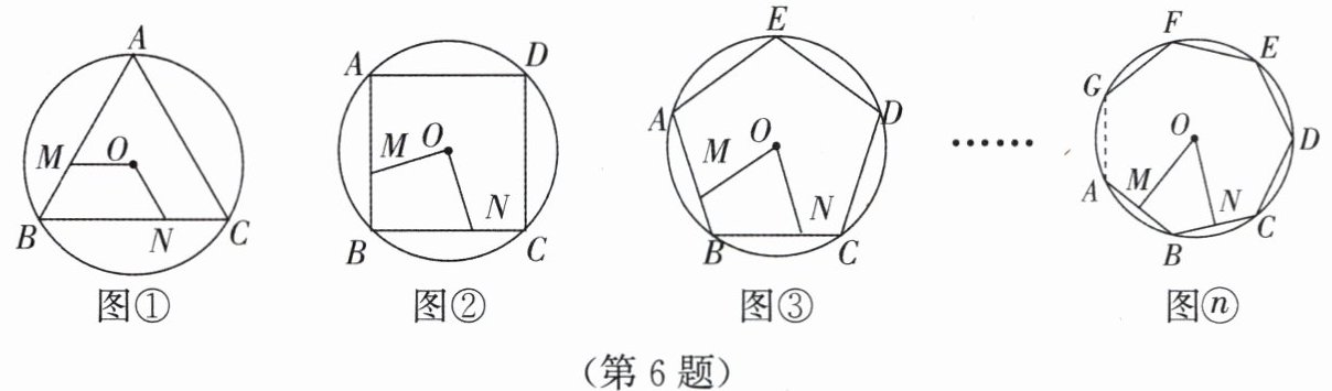 6. 在图①、图②、图③、…、图ⓝ中,M,N 分别是$\odot O$的内接正三角形 ABC、正方形 ABCD、正五边形 ABCDE、…、正$n$边形 ABCDEFG…的边 AB,BC 上的点,且$BM = CN$,连接$OM$,$ON$.