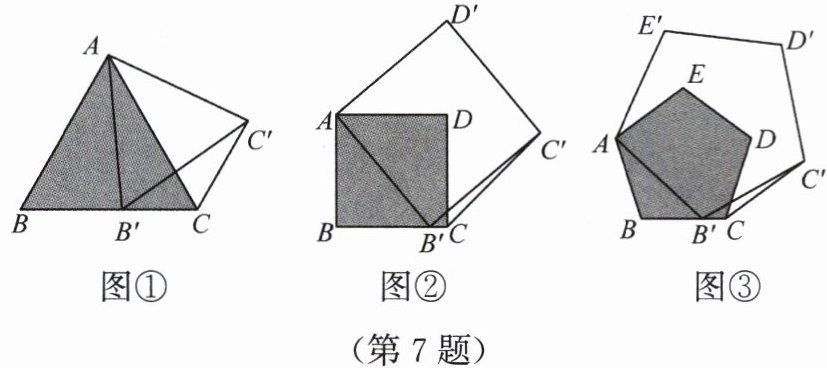 7. 如图①~③分别是由有公共顶点 A 的两个正三角形、两个正方形和两个正五边形组成的图形,且其中一个正多边形的顶点$B'$在另一个正多边形的边 BC 上.