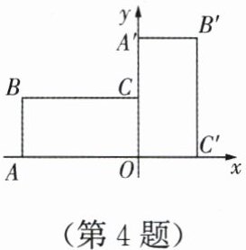 4. (2024, 吉林, 5) 如图, 在平面直角坐标系中, 点$A的坐标为(-4, 0)$, 点$C的坐标为(0, 2)$. 以$OA$,$OC为边作矩形OABC$. 若将矩形$OABC绕点O顺时针旋转90^{\circ}$, 得到矩形$OA'B'C'$, 则点$B'$的坐标为(