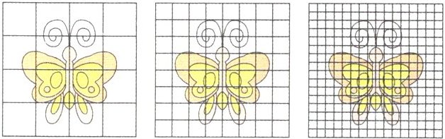 5. 下面三个大正方形的边长都表示16厘米,先计算每个大正方形中一个小方格的面积,再估计蝴蝶的面积。