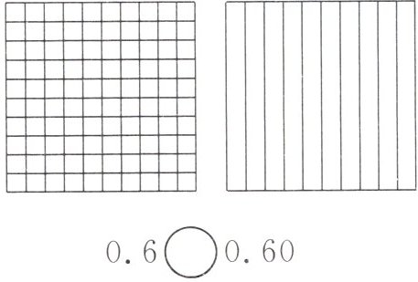 左边是一个 10×10 的方格图,共 100 个小方格,可给其中 60 个小方格涂色(横向或纵向等任意方式,能表示 0.6 即可,比如涂 6 行每行 10 个中的 60 个 );右边是一个被平均分成 100 份的长方形图,给其中 60 份涂色。