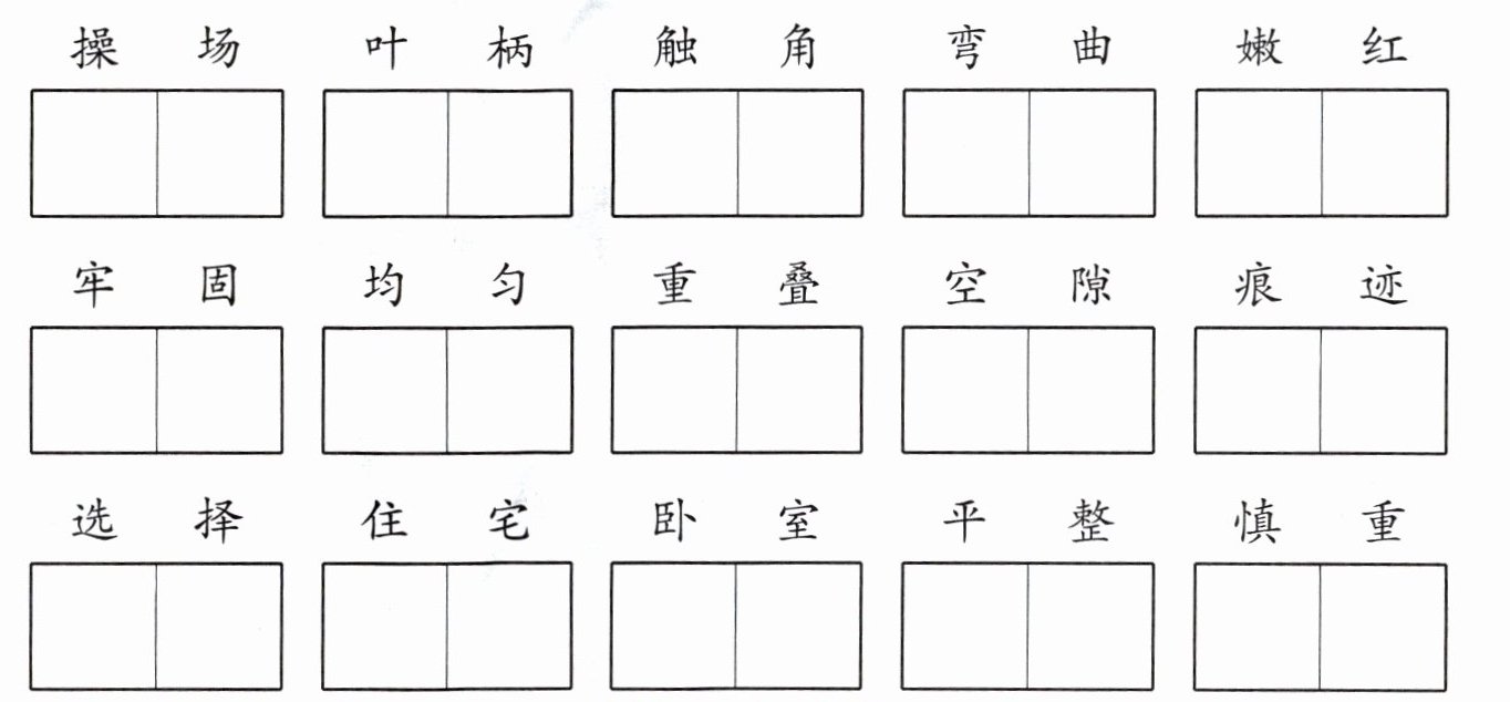 操场、叶柄、触角、弯曲、嫩红、牢固、均匀、重叠、空隙、痕迹、选择、住宅、卧室、平整、慎重