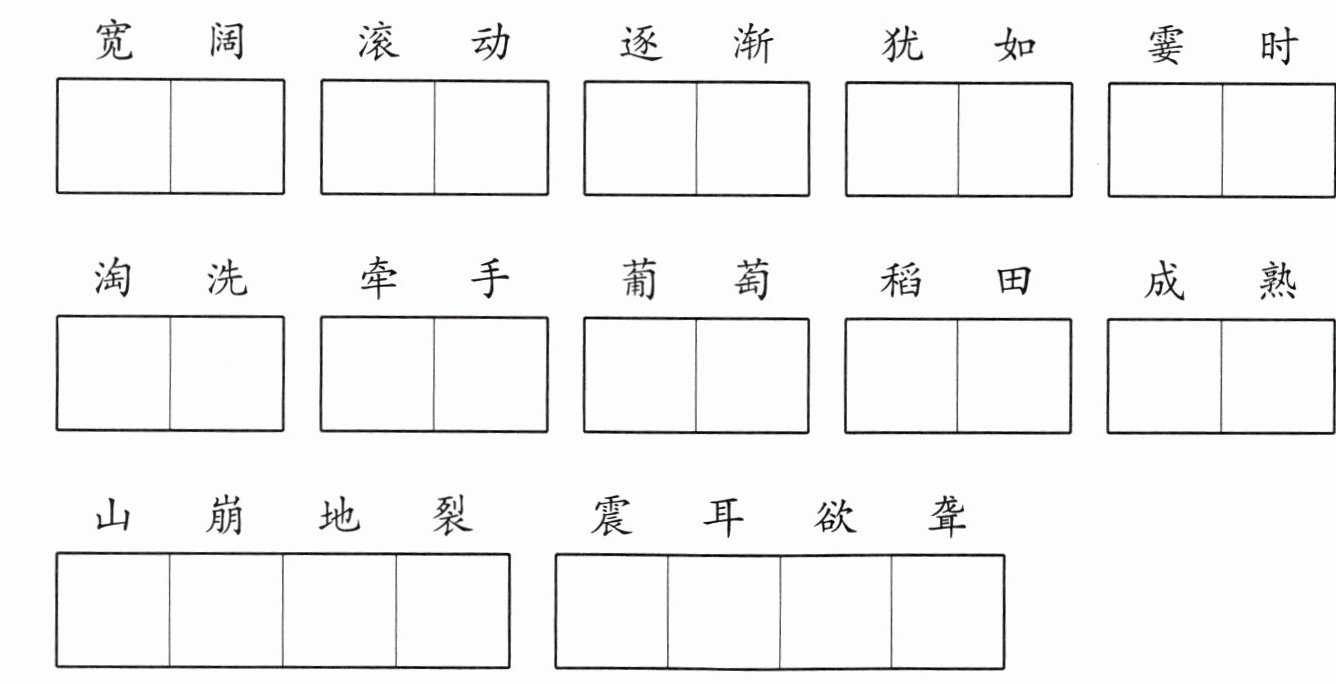 宽阔、滚动、逐渐、犹如、霎时、淘洗、牵手、葡萄、稻田、成熟、山崩地裂、震耳欲聋。
