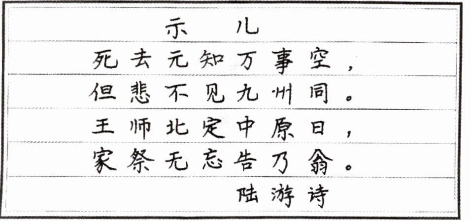 接下来四行依次书写诗句“死去元知万事空,”“但悲不见九州同。”“王师北定中原日,”“家祭无忘告乃翁。”;
