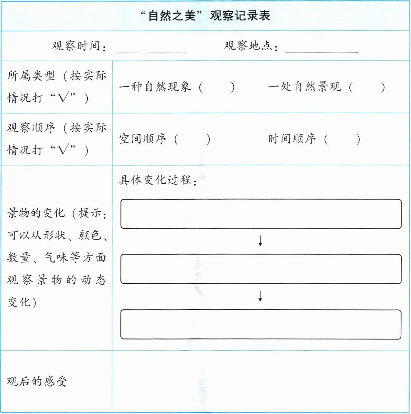 |景物的变化(提示:可以从形状、颜色、数量、气味等方面观察景物的动态变化)|具体变化过程:|