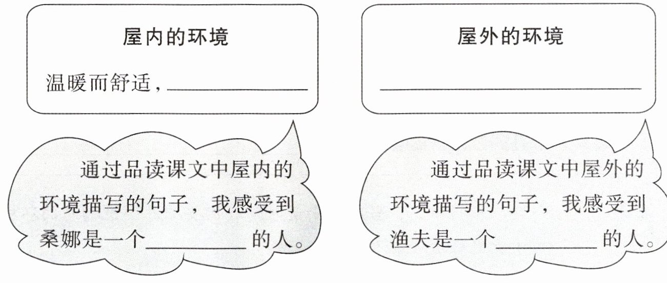 1. 桑娜家的小屋“温暖而舒适”,请你圈画出《穷人》一文中其他描写环境的词句,并总结填入方框内的横线上。想一想,在不同的环境下,你感受到桑娜夫妇身上有怎样的精神品质。