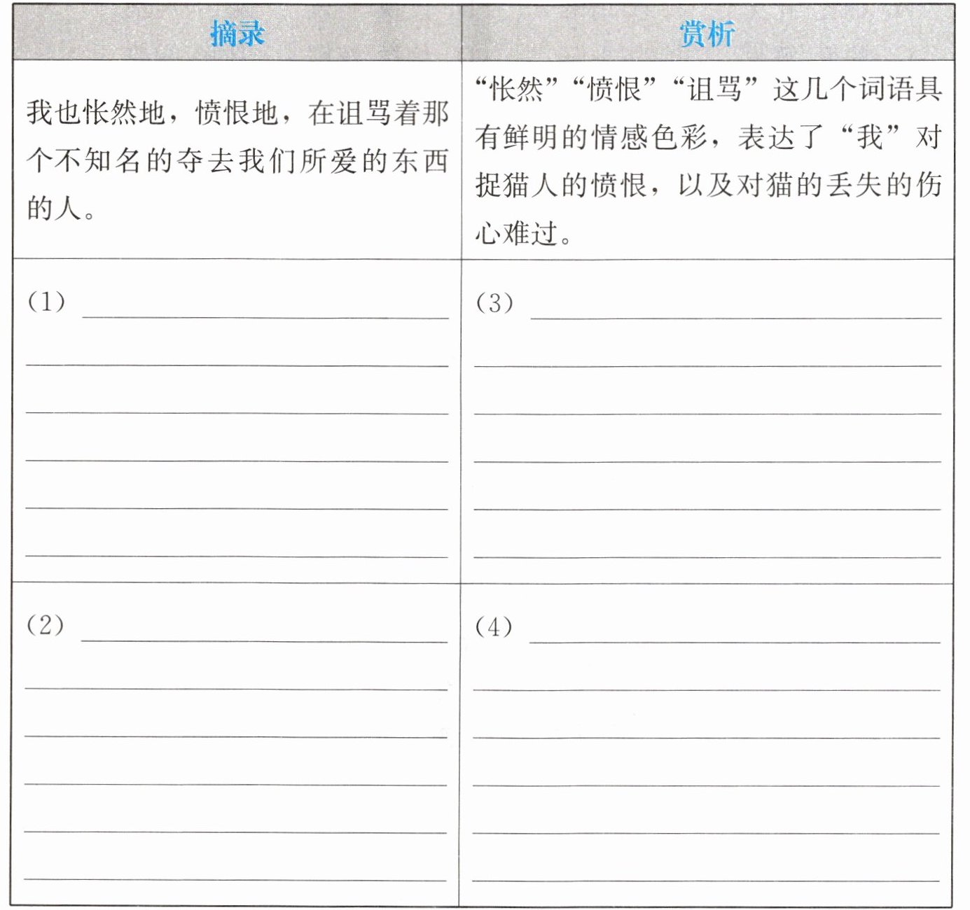 提升3. 阅读这篇课文,我们了解到一个爱猫的家庭最终“永不养猫”的故事,感受到了这家人情感的波澜,尤其是面对每只猫的亡失,“我”的内心活动被刻画得十分细腻。请你从文中找出每只猫亡失后,“我”的不同感受,仿照示例品读其中的情感。