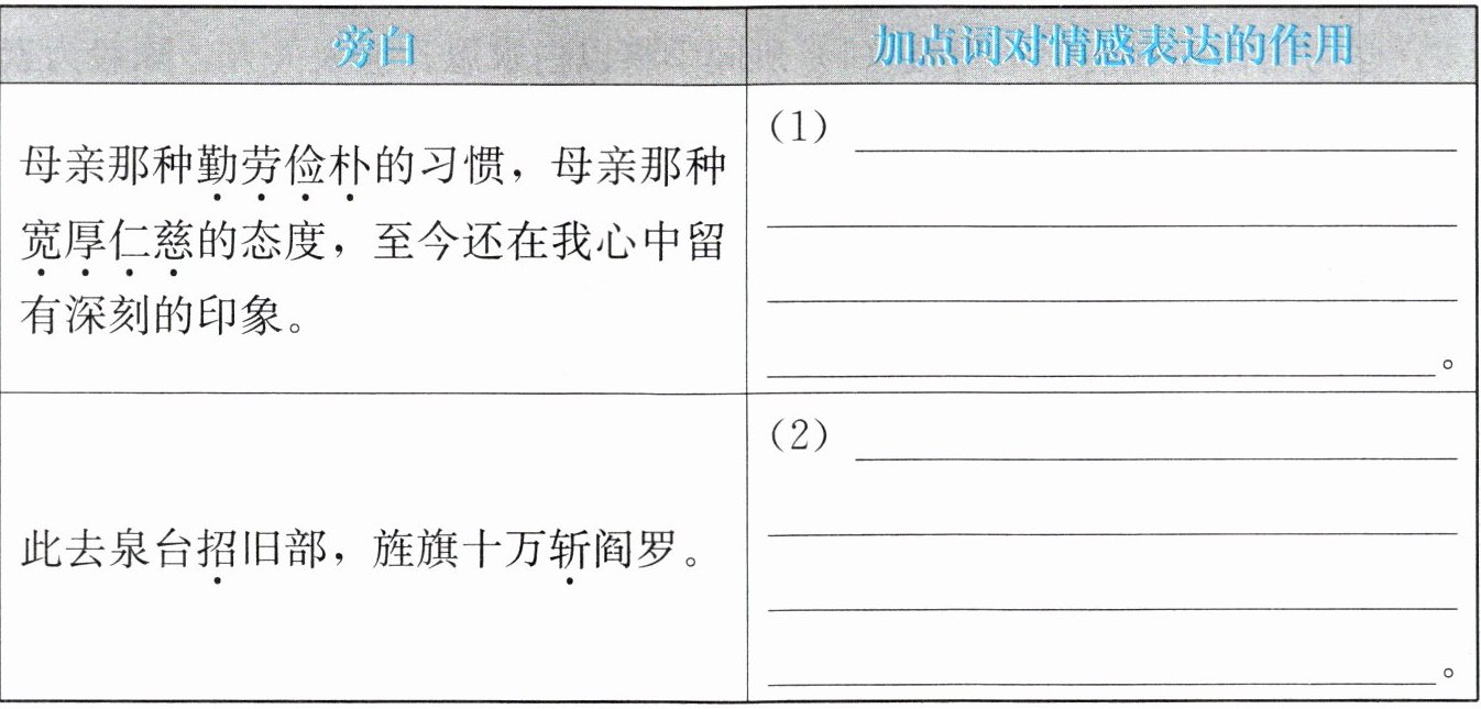 2.【定旁白】一个好的旁白能够提升短视频的质量。同学们围绕如何利用旁白更好地表达情感展开了讨论,有同学认为可以抓住句子中富有感情色彩的词语。如果将下面两句话作为旁白,请分析加点的关键词对情感表达的作用。