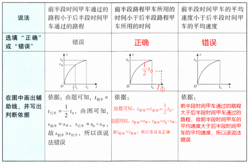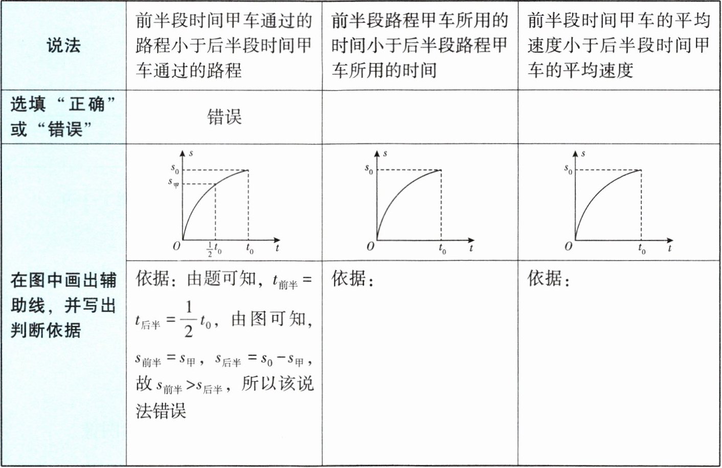 | 在图中画出辅助线,并写出判断依据 | 依据:由题可知,$t_{前半}= t_{后半}= \frac{1}{2}t_{0}$,由图可知,$s_{前半}>s_{后半}$,所以该说法错误 | 依据: | 依据: |