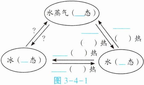 根据前面的学习我们知道,物质可以在不同物态之间变化,在图3-4-1中填空,说明水所处的物态、水的三态之间变化的名称及吸热、放热情况。