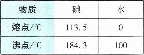 小资料:酒精灯火焰温度为500℃左右,标准大气压下碘和水的熔点和沸点如下表所示。