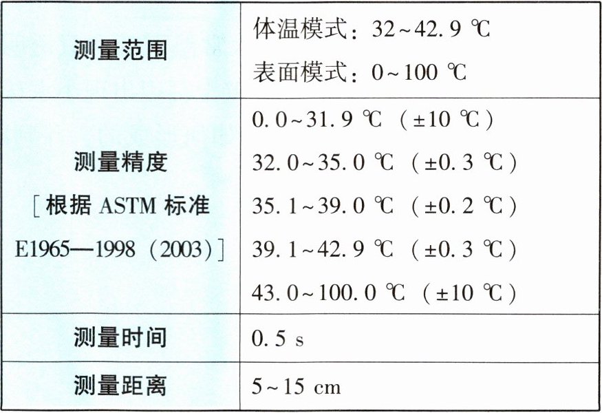| 测量精度[根据ASTM标准E1965—1998(2003)] | 0.0~31.9℃(±10℃)32.0~35.0℃(±0.3℃)35.1~39.0℃(±0.2℃)39.1~42.9℃(±0.3℃)43.0~100.0℃(±10℃) |