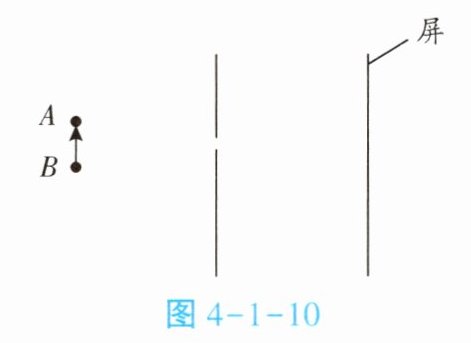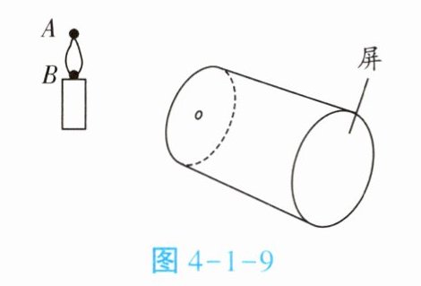阅读课本第90页的“想想做做”,了解小孔成像的原理。参照图4-1-9,在图4-1-10中分别画出烛焰上A、B点通过小孔在屏上形成的光斑。