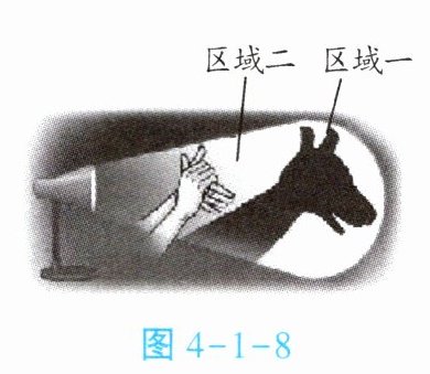 不能被光照射到。(以上两空均选填“区域一”“区域二”或“区域三”)墙壁上没有被光照射到的区域叫影,也叫影子。如图4-1-8所示,区域一