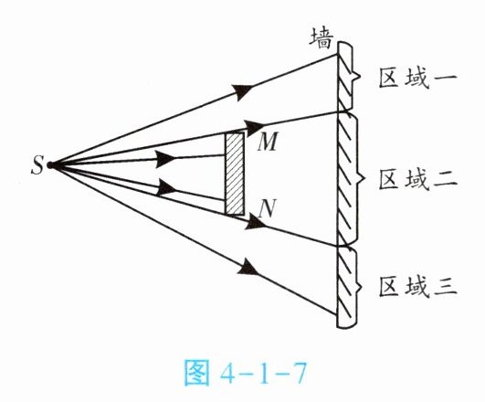如图4-1-7所示,S是一点光源(该环境中无其他光源),MN是不透明挡板。图中给墙壁划分的三个区域中,