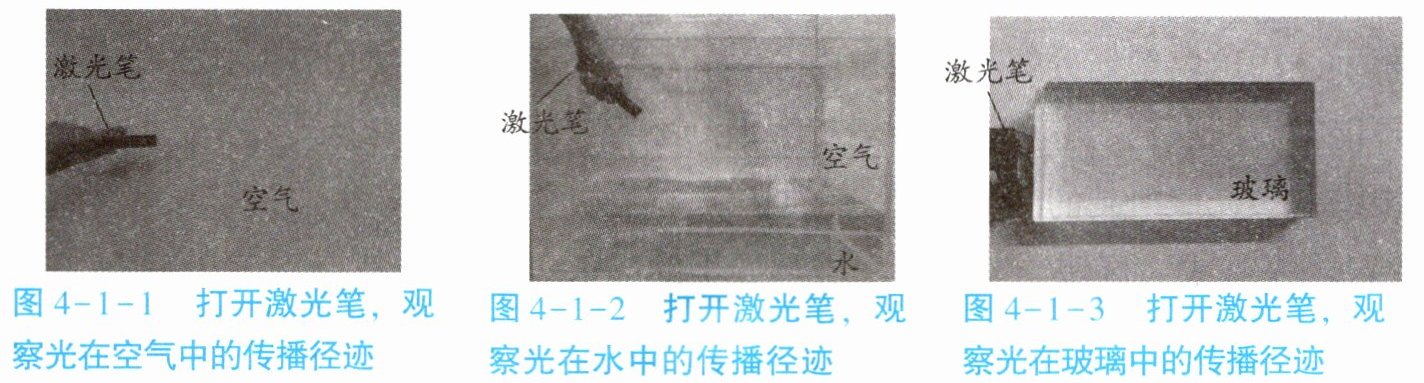 1. 教师演示图4-1-1至图4-1-3所示实验,学生观察并描述实验中激光的传播路径。据实验现象可得初步结论: