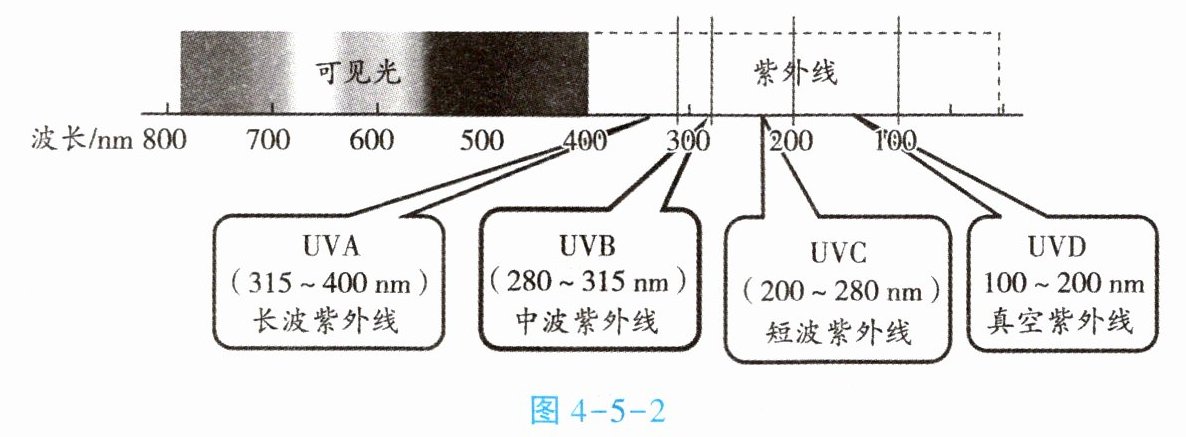 (3)如图 4-5-2 所示,紫外线按波段划分有 UVA、UVB、