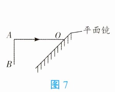 7.如图7所示,一束由A发出的光射到平面镜表面O点。在图7中画出物体AB在平面镜中的像,并画出入射光线AO的反射光线。