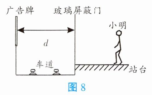 8.如图8所示,小明站在地铁站的站台上,他透过玻璃屏蔽门,可以看到车道另一侧竖直墙壁上的广告牌及自己在玻璃屏蔽门后面的虚像。小明根据该现象设计了在站台上粗测玻璃屏蔽门与车道另一侧广告牌之间距离d的实验。实验步骤如下,请完成相关内容。