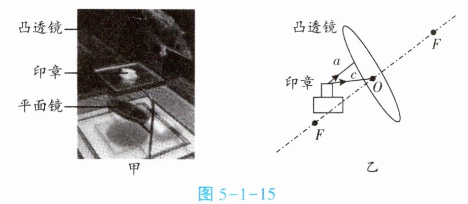 4. 如图5-1-15甲所示是博物馆内印章的展台,游客能看到放大的印章也能看到印章底部的字;图乙是其示意图,请在图乙中画出光线a、c经过凸透镜折射后的光线。