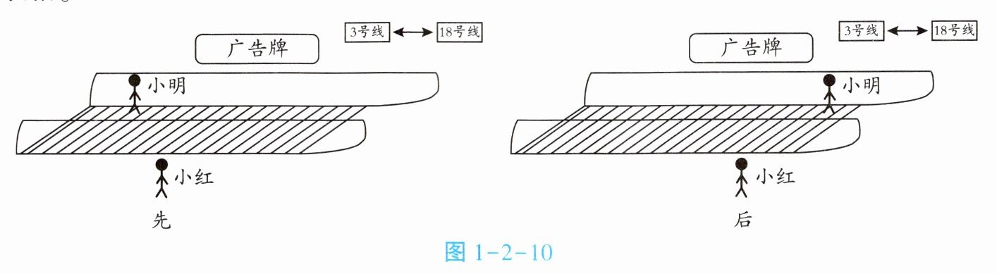 4. 广州地铁18号线是中国第一条时速160千米的全地下市域快线。为了方便乘客换乘,番禺广场站设置了平地扶梯(水平扶梯)。小明在换乘过程中站在扶梯上随扶梯运动,先后被拍到如图1-2-10所示照片,请根据图像填写下方表格。
