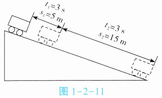 5. 如图1-2-11所示,一辆小车沿斜面下滑。请判断:$t_1和t_2$哪段时间小车的速度更快?请结合速度计算公式说明你的理由。