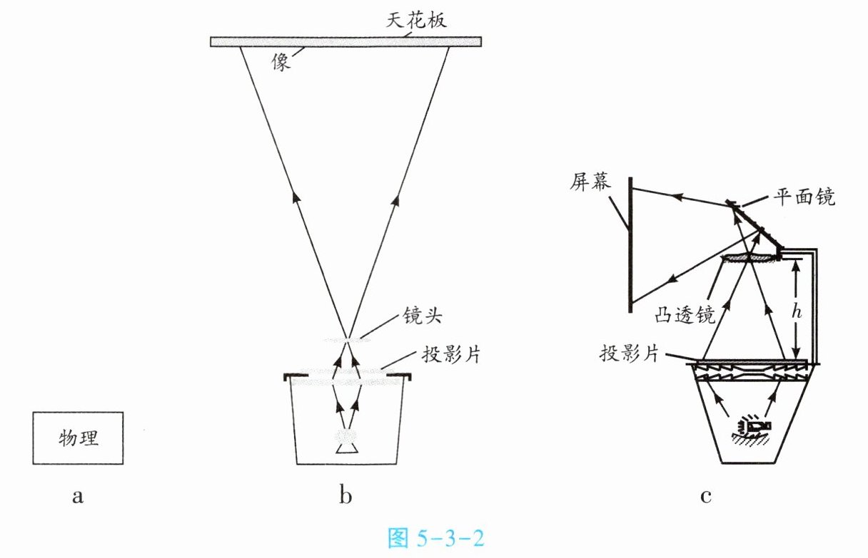 2. 将图5-3-2a投影片上很小的“物理”两个字直接放在黑板上,因字太小,学生看不清楚。为了把投影片上的字通过投影仪的镜头放大,并投于前方屏幕上,应利用凸透镜的哪种成像规律?