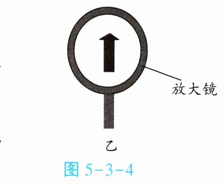 1. 如图5-3-4甲所示,纸上印有一个箭头。小明将一个放大镜(镜片为凸透镜)放到箭头前面,如图5-3-4乙所示,箭头经透镜所成的像的性质是
